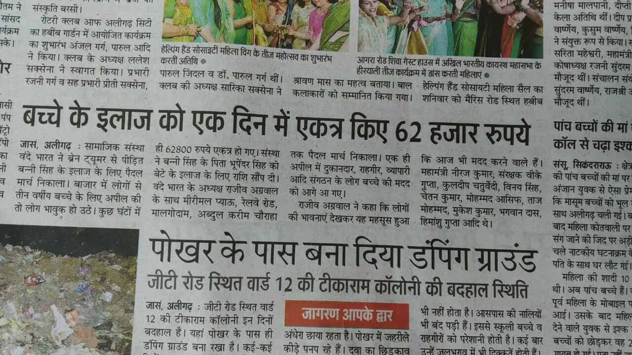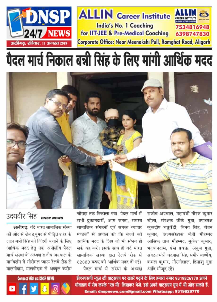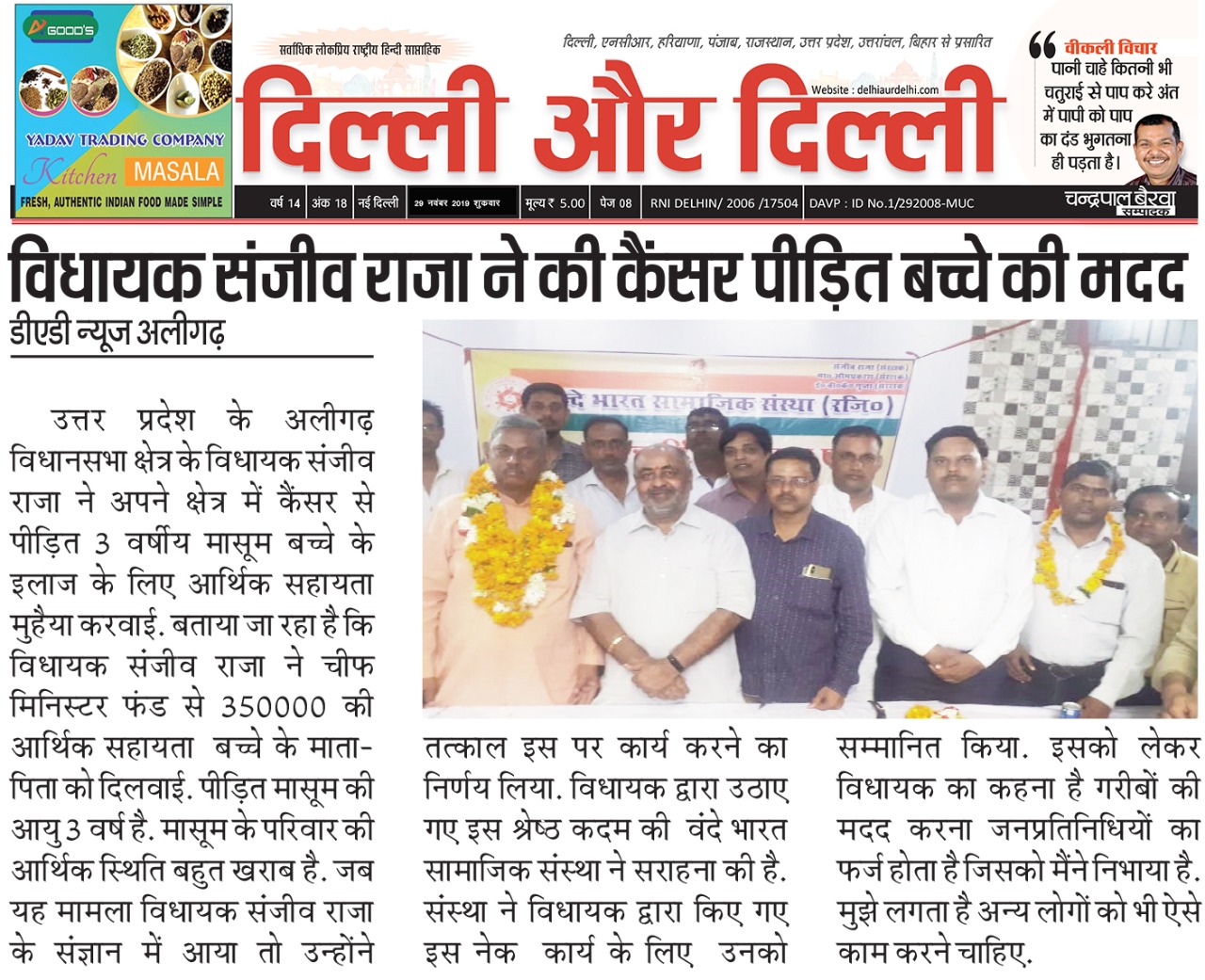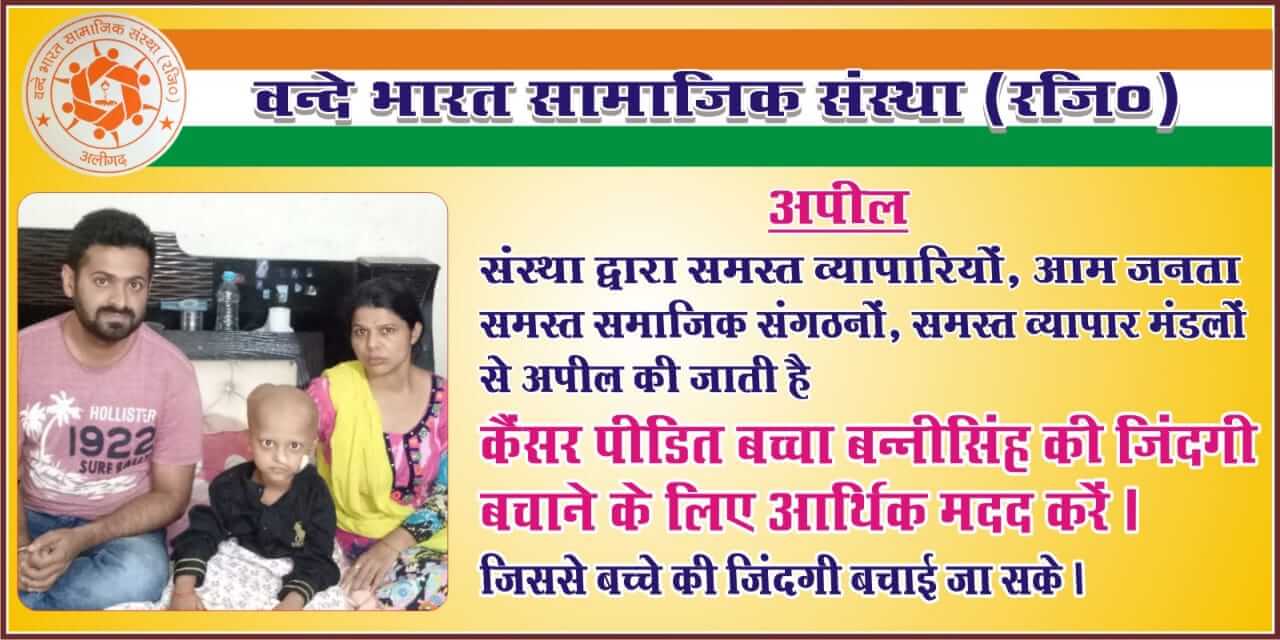 Vande Bharat helped Banni Singh who was 6yo and was diagnosed with cancer with a financial support of ₹62,800. This money was raised through donation by conducting a foot march. City MLA Mr. Sanjeev Raja provided financial support form CM fund of ₹3,50,000