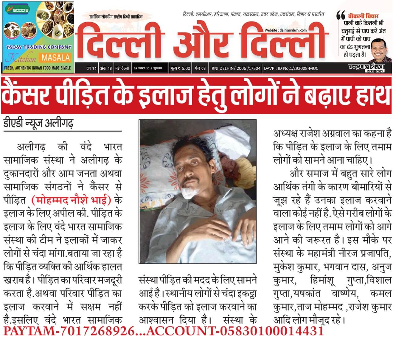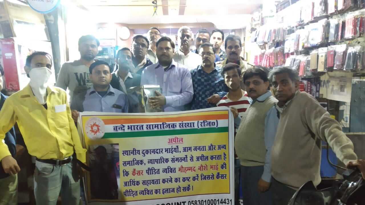 Vande Bharat Samajik Sanstha with the help of locals managed to collect funds for cancer patient Mohammed Naushe Bhai. Team of Vande Bharat organized a rally for collection of funds. Total funds collected from the collection was ₹19,820. Vande Bharat Team also made an additional contribution of ₹20,160. The total collected amount of ₹39,980 was given to Naushe Bhai for treatment.