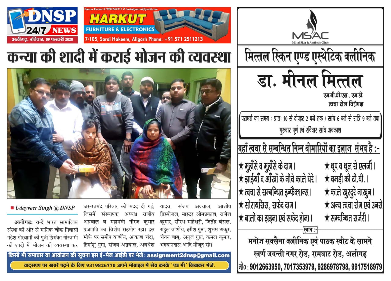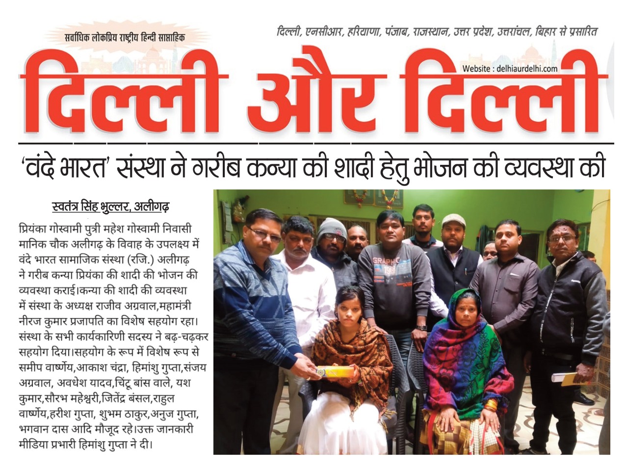 Vande Bharat Samajik Sanstha helped in the marriage of Priyanka Goswami by proving food at her marriage. This help was made possible by the members of the organization.